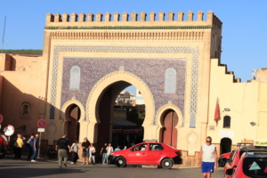 Hier prallen Tradition und Moderne aufeinander: Der Weg zur Medina führt über einen sechsspurigen, rund fünfzehn Kilometer langen Boulevard – besenrein, makellos gepflegt und gesäumt von modernen Bauten, Neubauvierteln und Einkaufszentren. Doch irgendwann biegen wir ab – hinaus aus dieser „brave new world“, hinein durch ein Tor in der alten Stadtmauer und schließlich durch das berühmte blaue Tor, das Bab Boujloud, mitten ins lebhafte Getümmel der Medina.