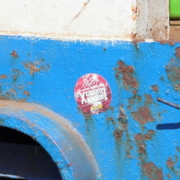 Es war mal wieder einer dieser kaum zu glaubenden Zufälle, dass wir den Sticker überhaupt entdeckt haben. Erstens verkehren mehrere Fähren auf dieser Strecke, zweitens sind sie meist proppevoll, und drittens stellten wir ausgerechnet direkt vor dem Aufkleber unsere Räder ab. Auf dem ersten Bild hatte ich ihn übrigens noch gar nicht bemerkt.