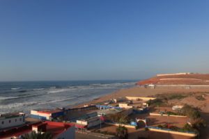 Unser nächstes Ziel ist die kleine Küstenstadt Sidi Ifni. Rechts fällt die Steilküste des Atlantiks jäh ab, links erhebt sich das Gebirge des Antiatlas. Eine kurvige Strecke durch bräunliche Landschaften. Wir beobachten Gleitschirmflieger, die kurze Sinkflüge absolvieren, und fragen uns, worin hier wohl der Reiz liegt.