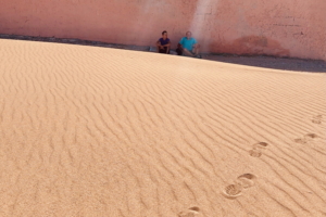 Nach einer Nacht im Zelt an einer Tankstelle erreichen wir Boujdour, wo wir von zwei Hamburgern, die mit dem Fahrzeug auf dem Weg nach Gambia sind, zum Bier eingeladen werden – dankend angenommen.