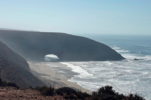 Spontan entdecken wir einen Hinweis auf einen malerischen Felsbogen, der ins Meer ragt. Wir rumpeln über eine Sand- und Steinpiste zur Küste – und werden tatsächlich fündig. Statt zum Strand hinabzusteigen, setzen wir uns auf zwei herumliegende Steine, mampfen Kekse, trinken Wasser und genießen einfach nur die Aussicht.